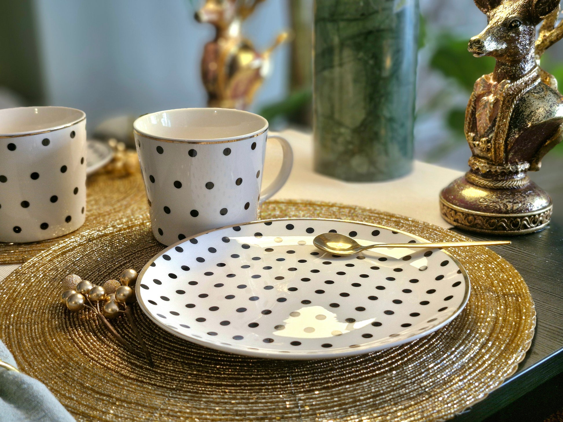 A chávena e o prato apresentam detalhes dourados e o icónico padrão polka dot, leve, contemporâneo e intemporal, perfeito para quem adora detalhes delicados com personalidade.