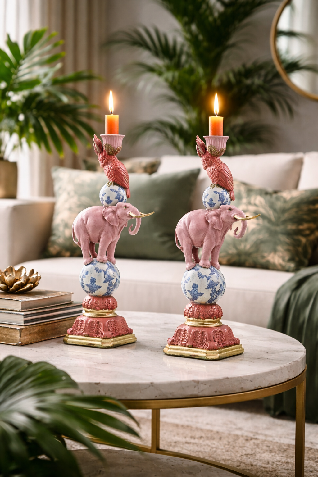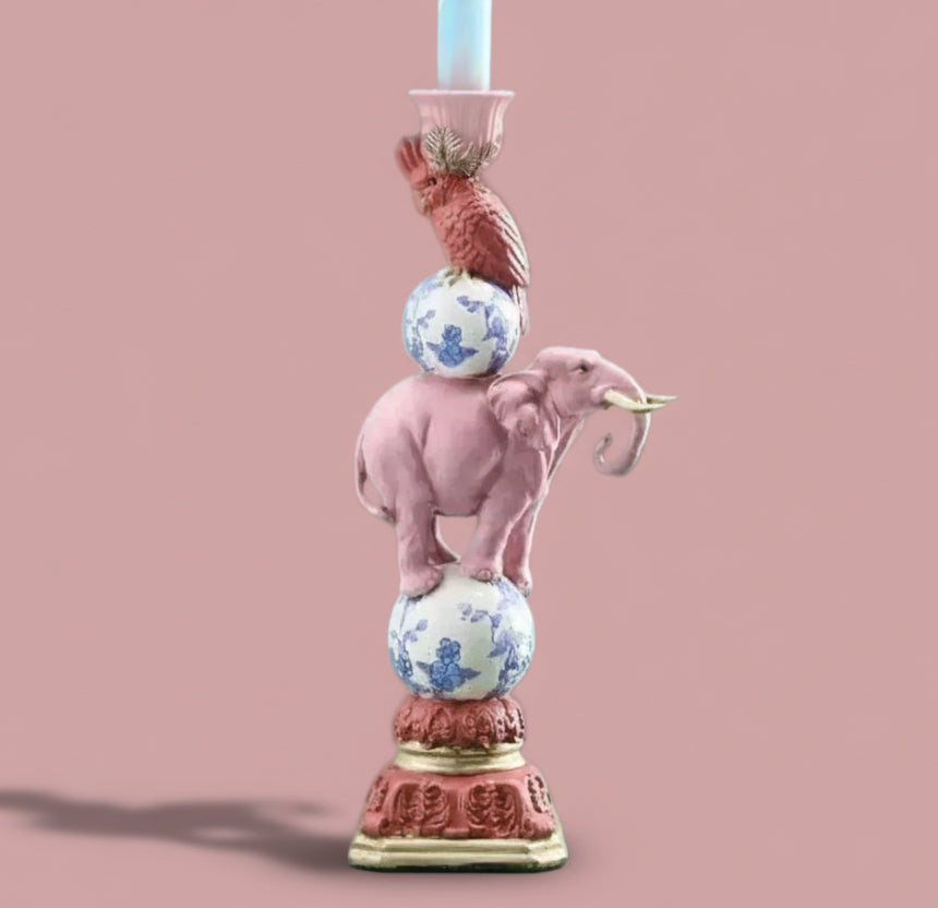 Com um design delicado e irreverente, este castiçal combina a elegância de formas clássicas com um toque inesperado — um elefante em tons suaves, equilibrado por um papagaio e detalhes florais que lhe dão vida.