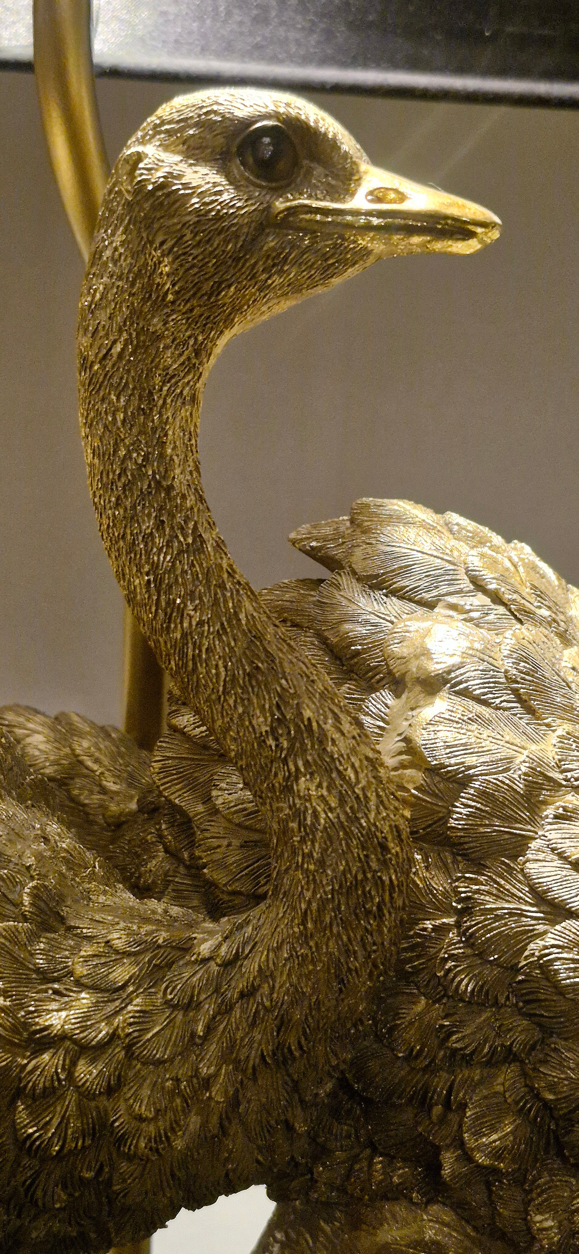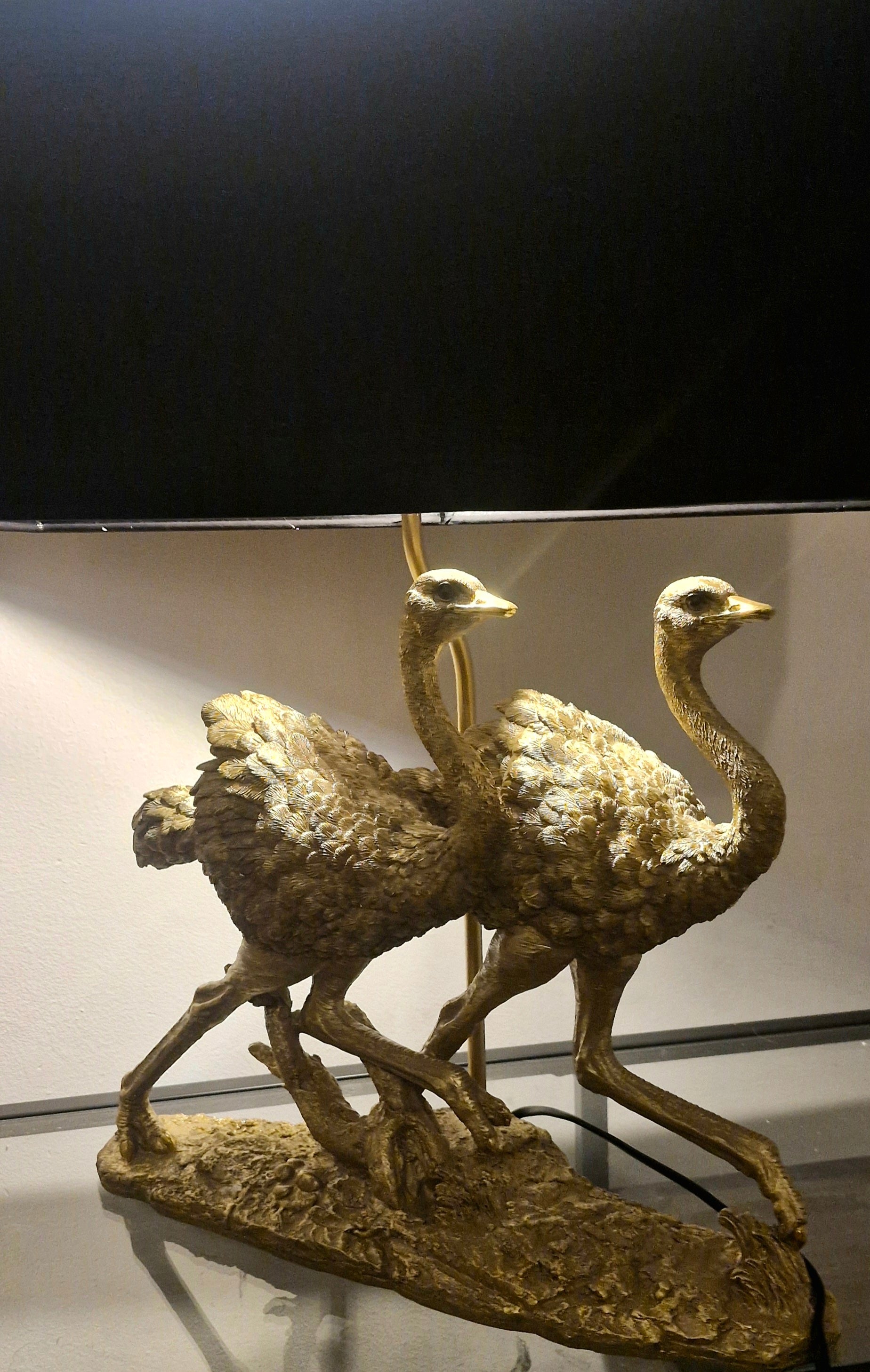 Um escultural candeeiro, que tem como base duas avestruzes douradas com detalhes texturizados, que criam um efeito visual luxuoso, ousado e com muita personalidade.