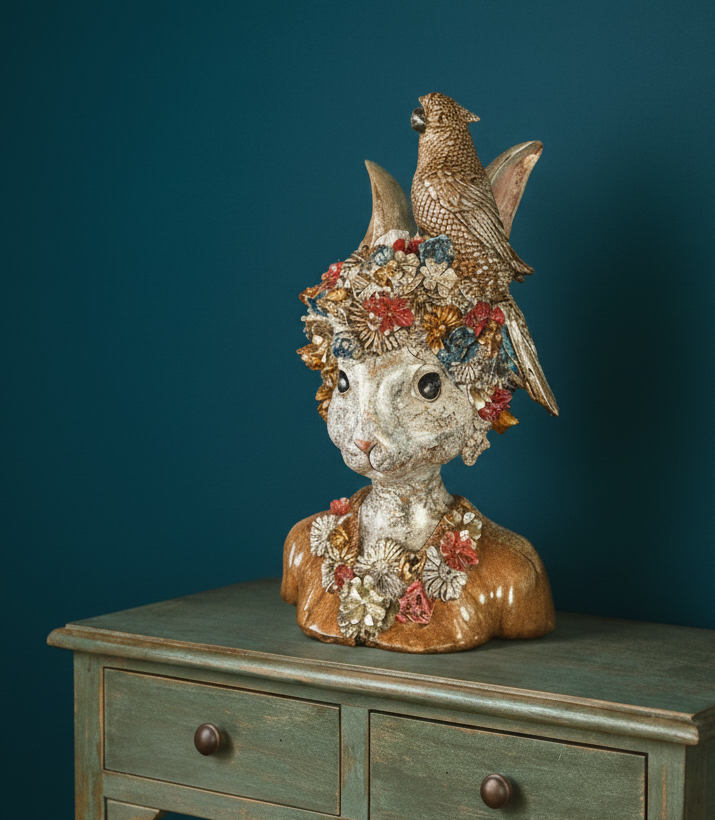 Escultura decorativa de coelha com acabamento detalhado e expressão suave que combina sofisticação clássica com presença statement, trazendo glamour artístico e personalidade irresistível ao espaço.