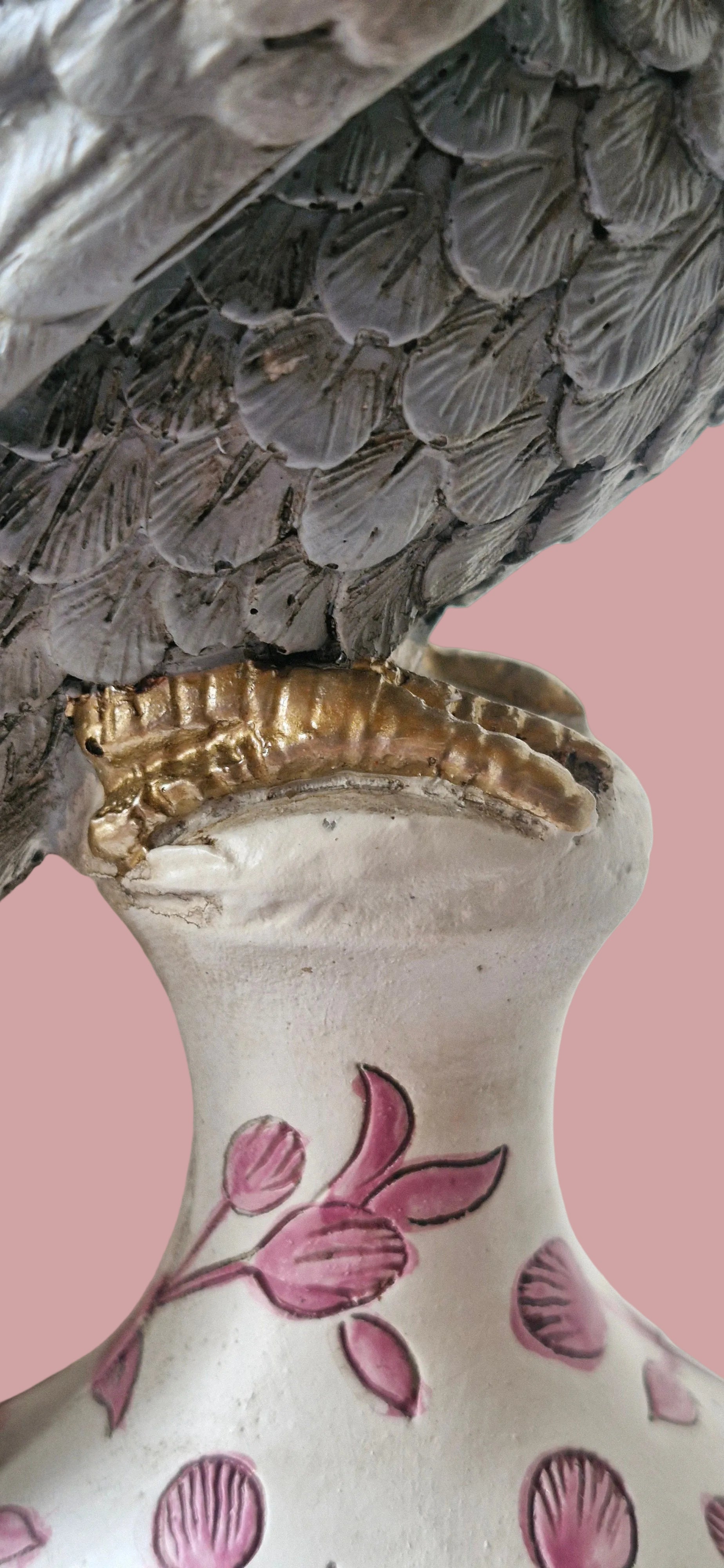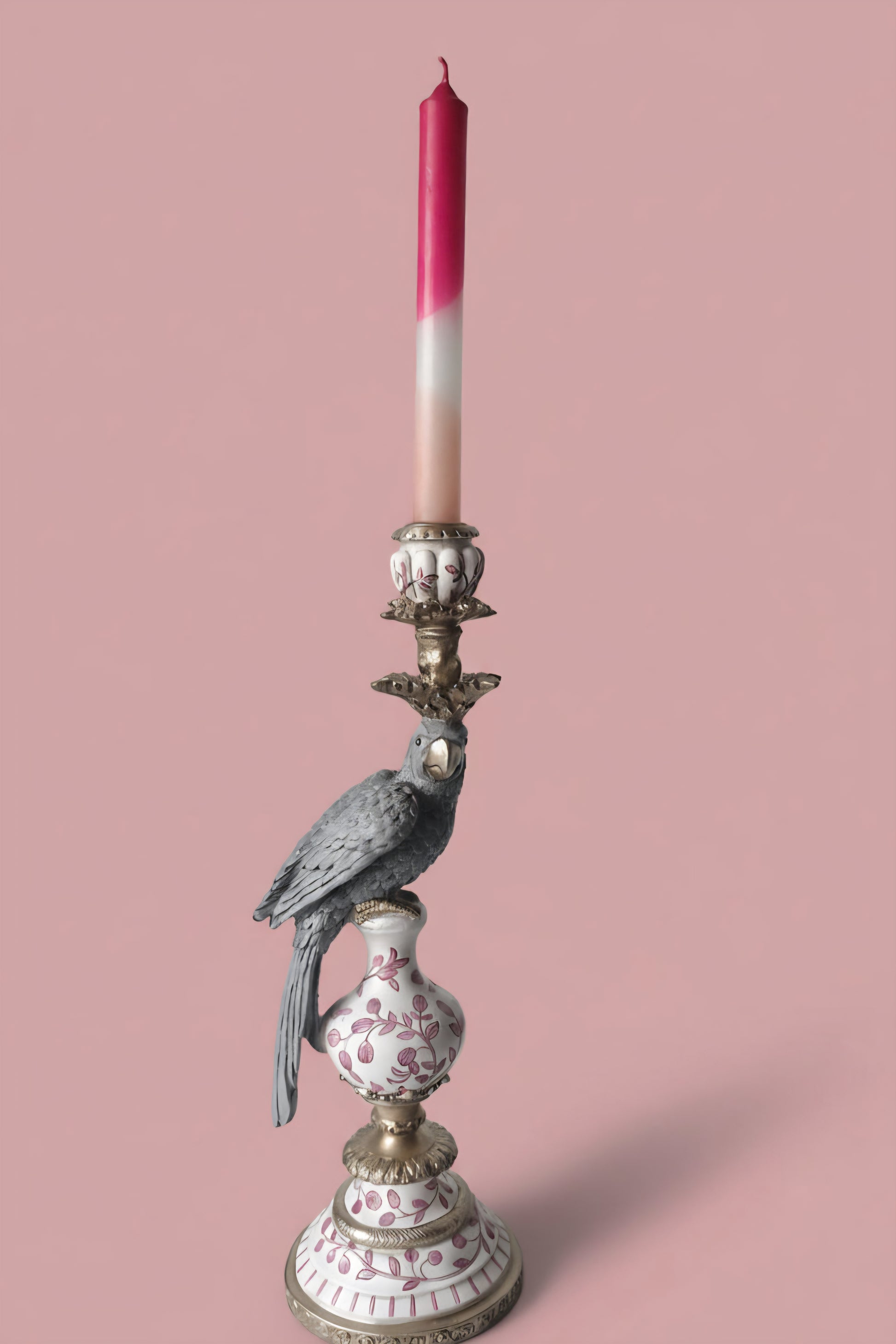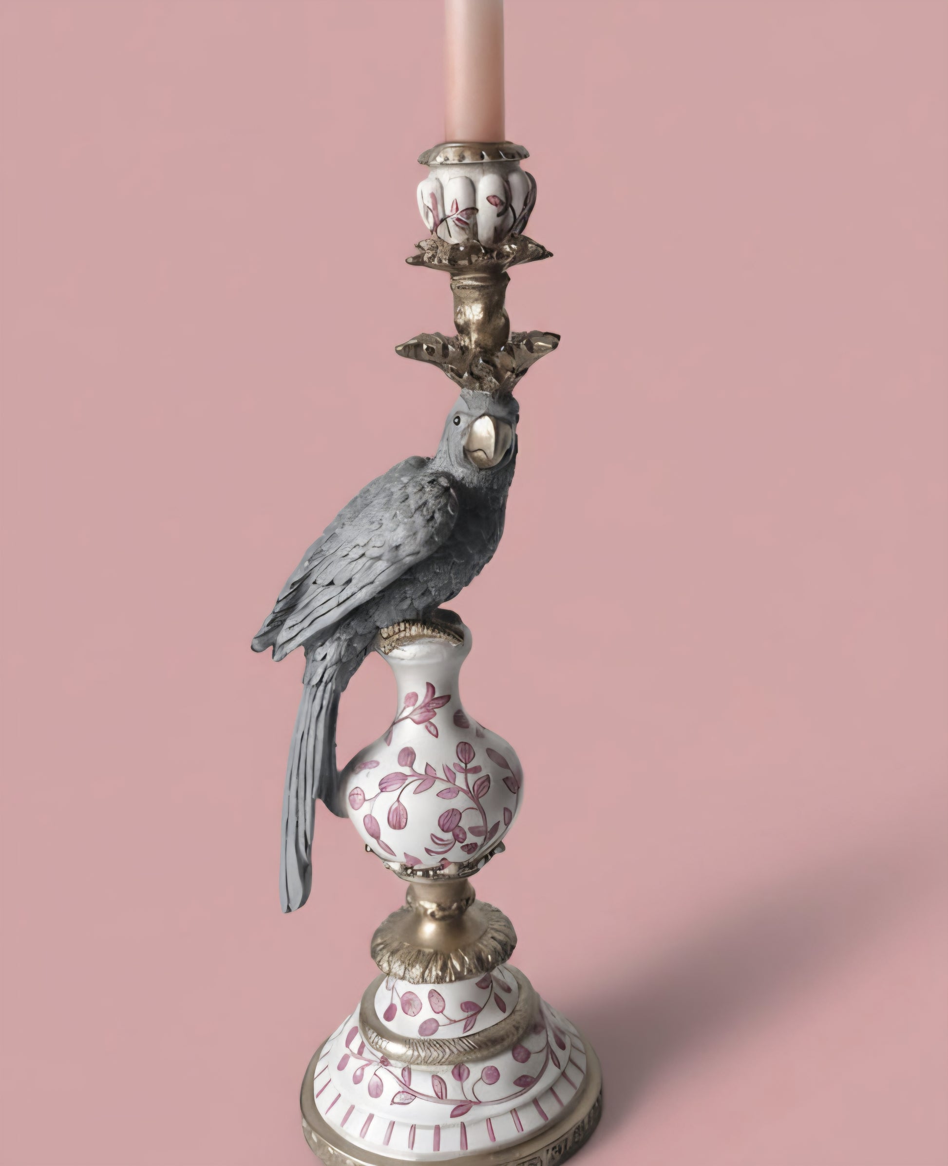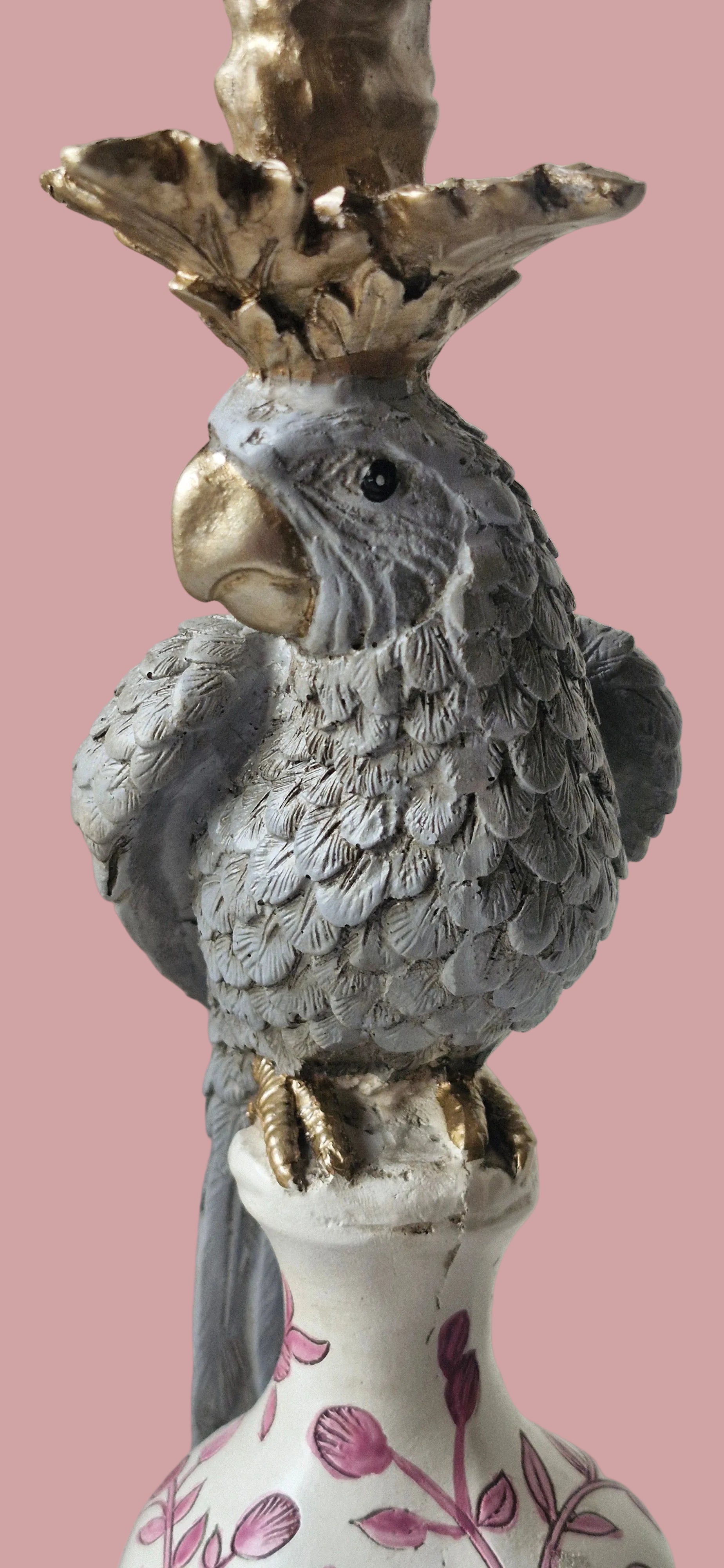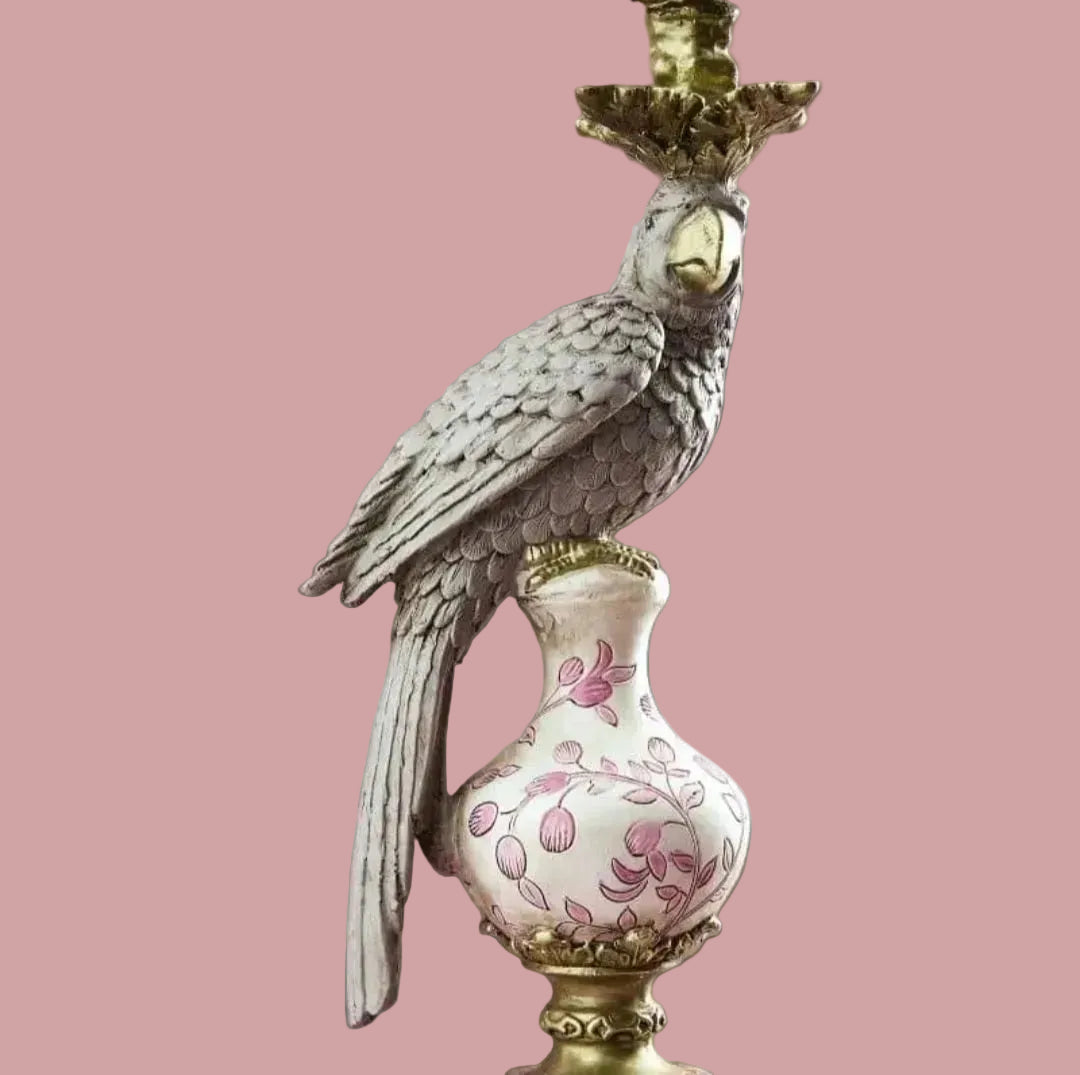 A figura do papagaio, pousada sobre uma base trabalhada com motivos florais, traz um equilíbrio subtil entre o clássico e o inesperado.