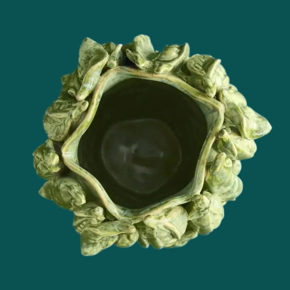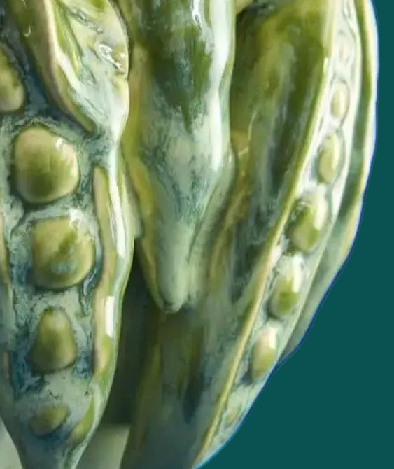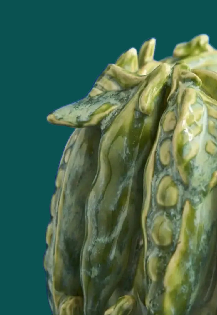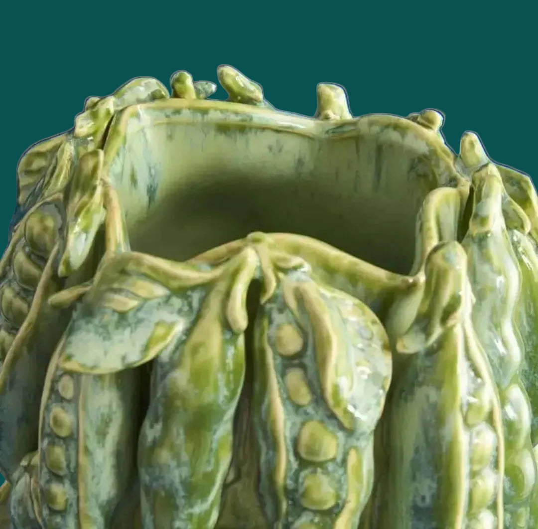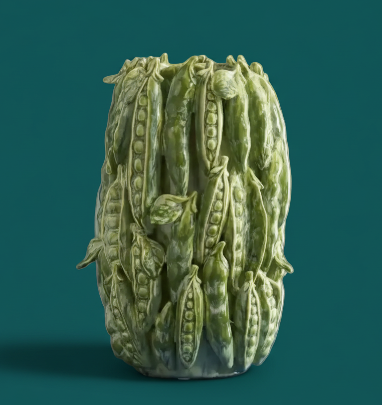 Jarra em grés artesanal com ervilhas esculturais em relevo e tons de verde vibrante que combina humor sofisticado com design orgânico, trazendo frescura natural e personalidade encantadora ao espaço.